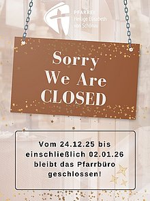 Zentrales Pfarrbüro und Kontaktstellen bleiben vom 24.12.2025 bis einschließlich 02.01.2026 geschlossen! Bitte beachten Sie unsere Schließzeiten. Ab dem 05.01.2026 sind wir wieder wie gewohnt für Sie erreichbar.
