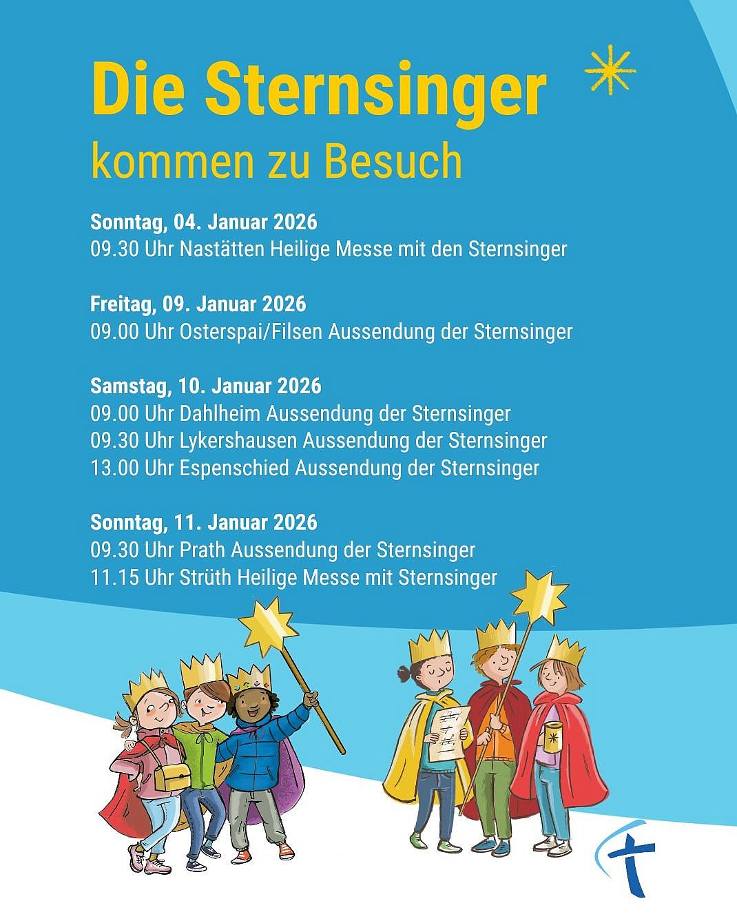 In vielen unserer Orte werden Sternsingerinnen und Sternsinger mit ihren Begleitungen unterwegs sein. Sie bitten um Spenden für die benachteiligten Kinder dieser Welt und erzählen von Gottes Segen. Sie schreiben den Segensspruch auf die Türen oder bringen einen Aufkleber an, wo es gewünscht wird. C + M + B sind nicht, wie oft angenommen, die Namen der "Könige" Caspar, Melchior und Baltasar, sondern sind die Buchstaben für die Segensformel "Christus mansionem benedicat" (Christus segne dieses Heim/Haus).
