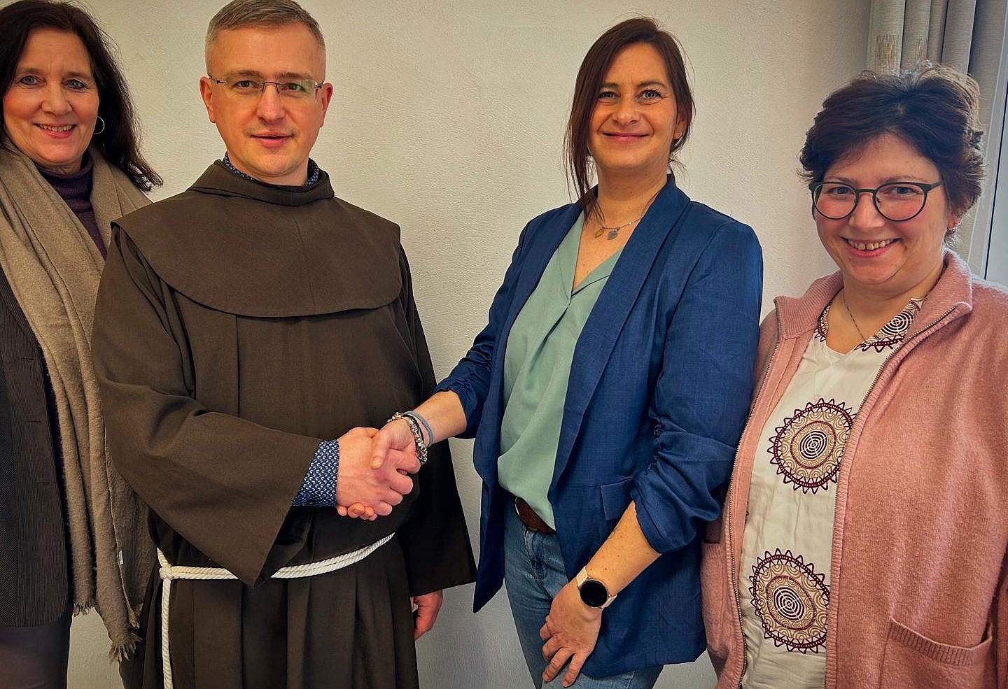 Zu Jahresbeginn begrüßt die Pfarrei St. Elisabeth von Schönau, vertreten durch Pater Hugon Superson OFM und die Kita-Koordinatorin Elke Brehmer, mit großer Freude das neue Leitungsteam Natalie Mies (zweite von rechts) als neue Einrichtungsleitung und Daniela Bach (rechts) als neue stellvertretende Leitung der katholischen Kita St. Peter und Paul in Nastätten.